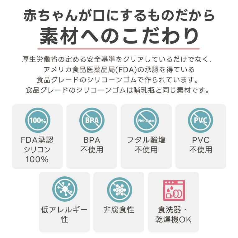 赤ちゃんの食事で使うグッズなので高品質で安全性が高い素材を使っています。