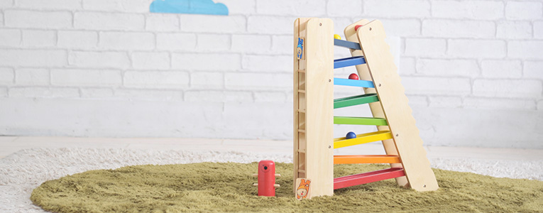 コロコロパーツをスロープに乗せて転がす他にも、 キリンの口にはめこんで入れたりと知育要素も◎回転しながら落ちていくコロコロパーツも模様も楽しい定番スロープトイです。