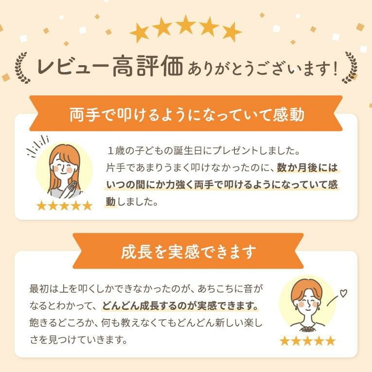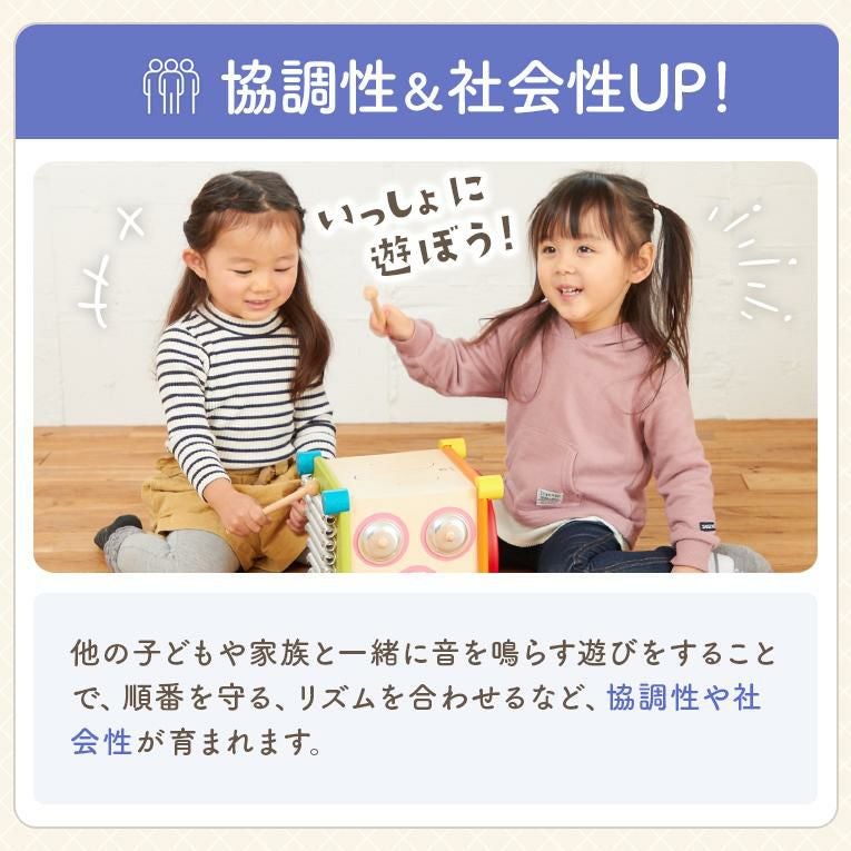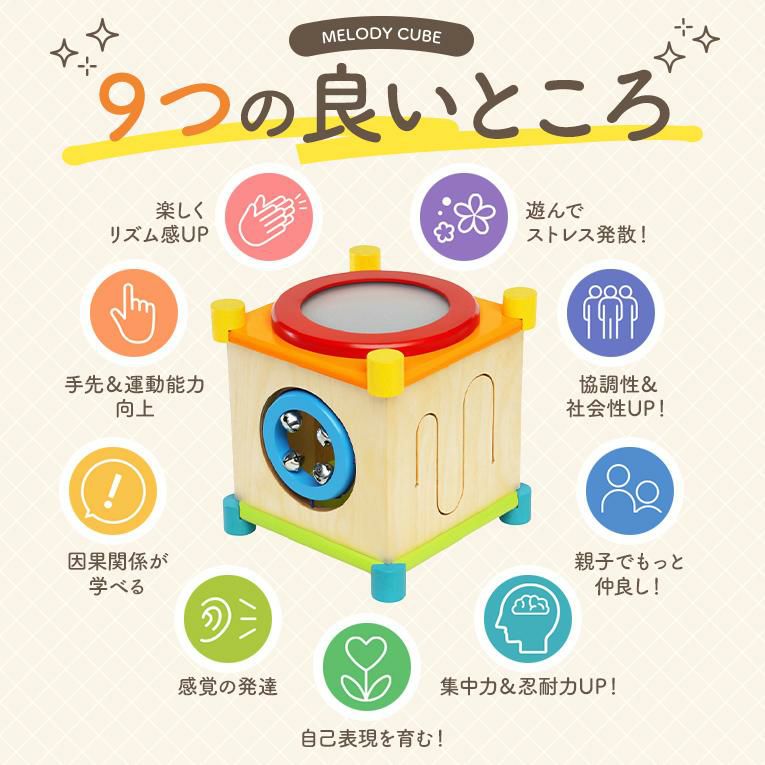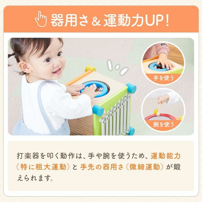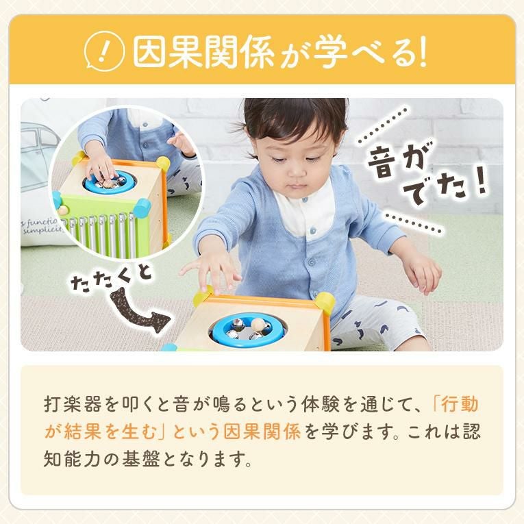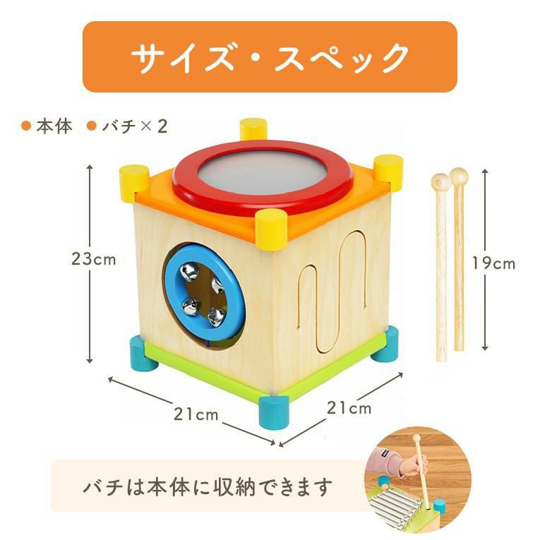 備考6面の音遊びができる音の鳴るきのおもちゃ。キューブ型の本体には鉄琴、太鼓、ギロ、シンバル、鈴の音遊びを搭載。2本のバチや手を使って遊ぶことができます。