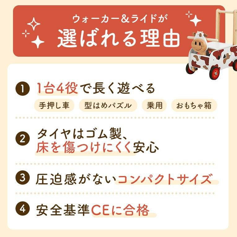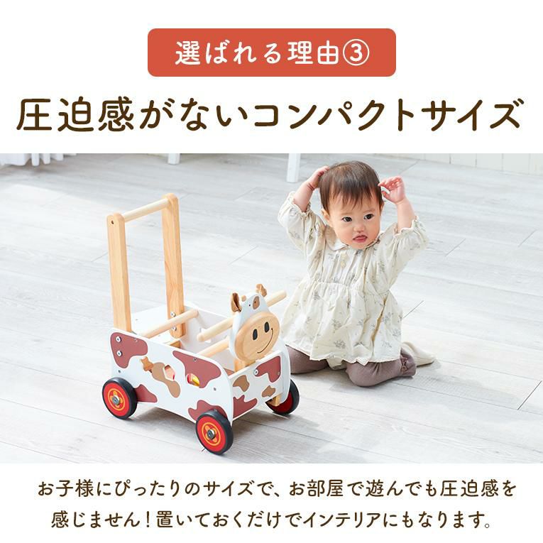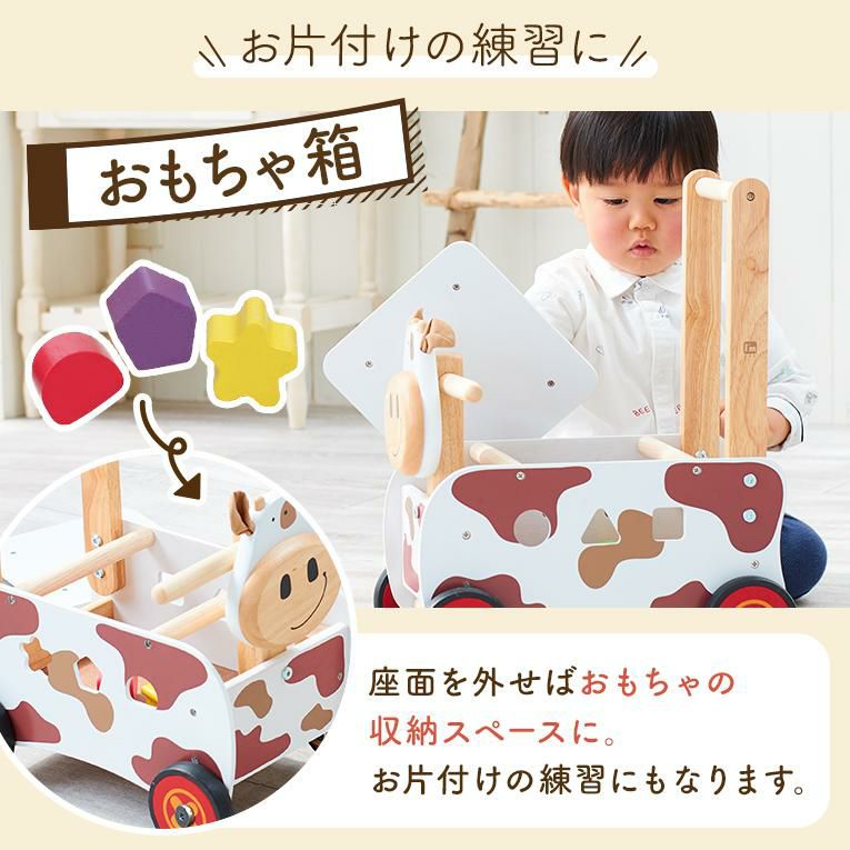 この手押し車は牛さんをお散歩しているように楽しく歩く練習をすることができます。