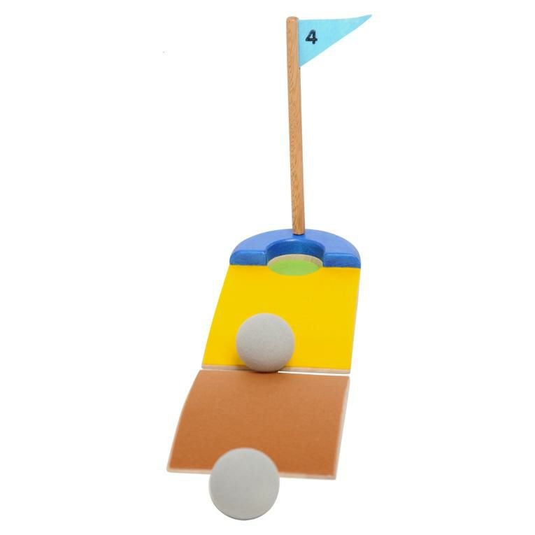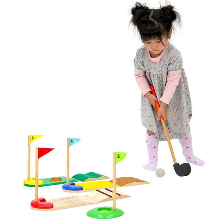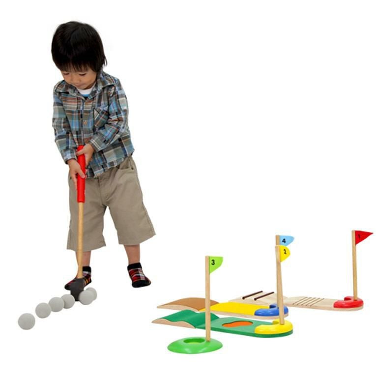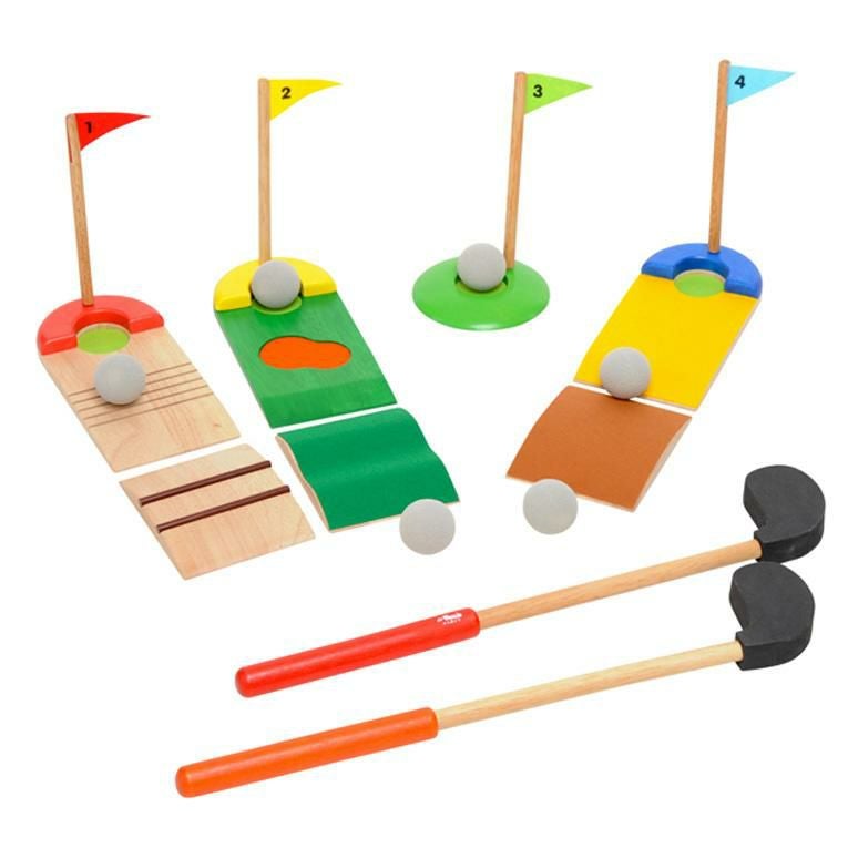 備考楽しい室内用の木のおもちゃのミニゴルフセット。 傾斜や仕掛けの違う4つのホールでパターゲームを楽しむことができます。ボールとクラブヘッドは柔らかい素材を使用していますので、床を傷つけることなく安心して遊べます。