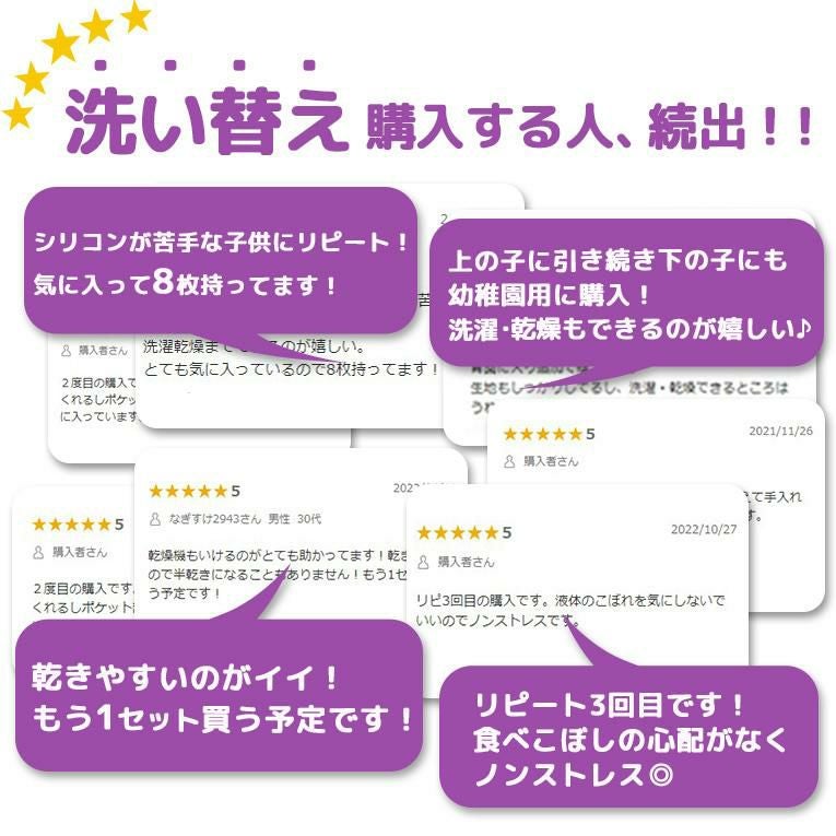 食べこぼしをキャッチするビブは毎日の離乳食タイムの必需品です。