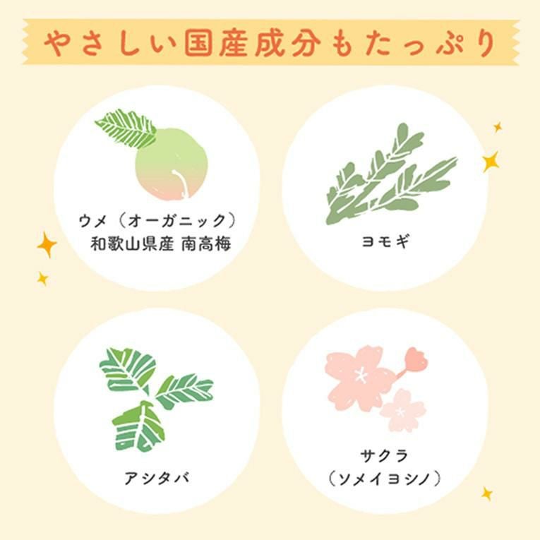 成分エタノール・セラック・水・安息香酸デナトニウム・ウメ果実エキス・ソメイヨシノ葉エキス・ヨモギ葉エキス・アシタバ葉/茎エキス・BG