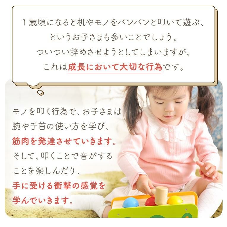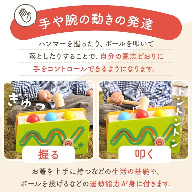 ハンマー遊びのハンマーを 逆に握れば楽器遊びのバチに早変わり。 たくさんの指先遊びでお子様の知的好奇心やファインモータースキルの発達をサポートします。