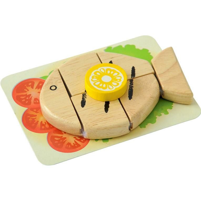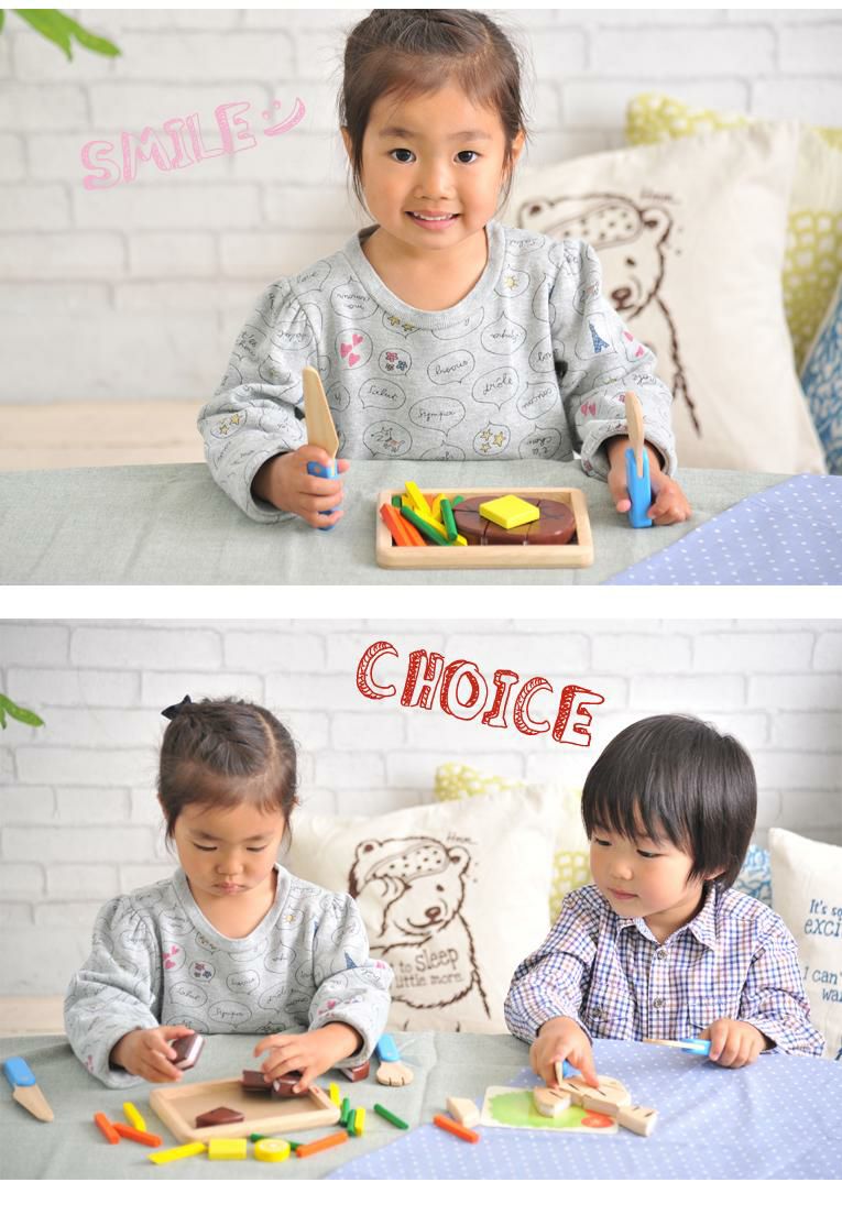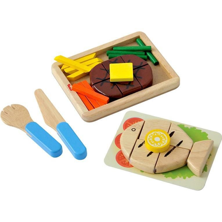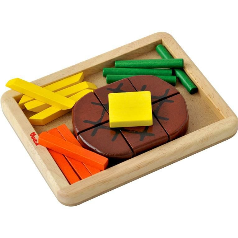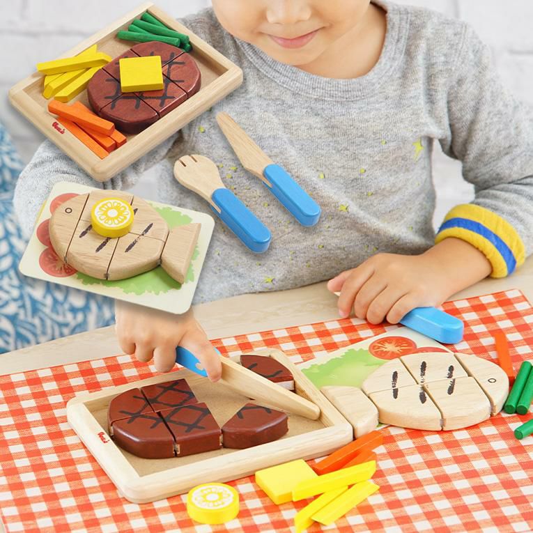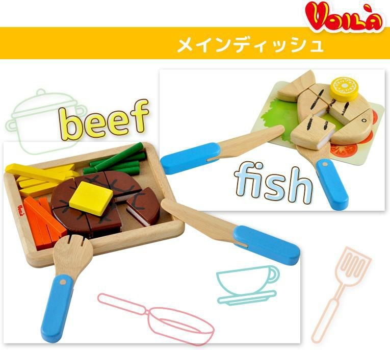 備考ステーキと魚の2種類のメインディッシュセットのおままごとの木のおもちゃ。付け合せにポテトやいんげん、ニンジン、バター、レモンとボリュームたっぷりに遊べます。ステーキと魚はナイフを使って6つにカットすることが可能です。