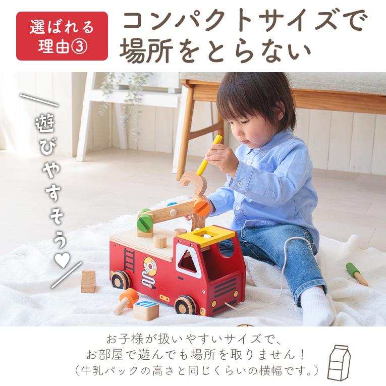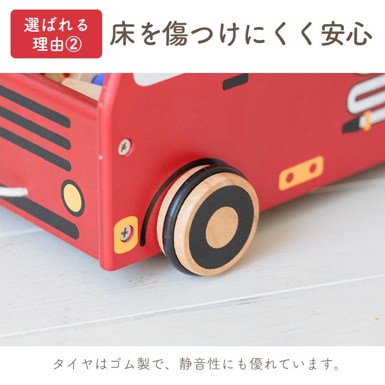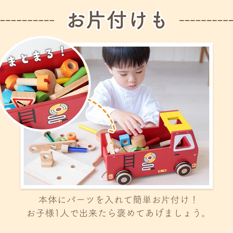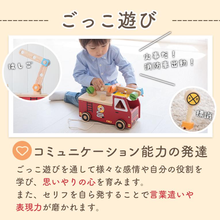 かわいい消防車の車体のサイドや荷台のカバーにあるネジ穴に、木製のドライバーやレンチ、 トンカチを使ってネジ回しやペグ打ちをして大工さんごっこが出来ます。