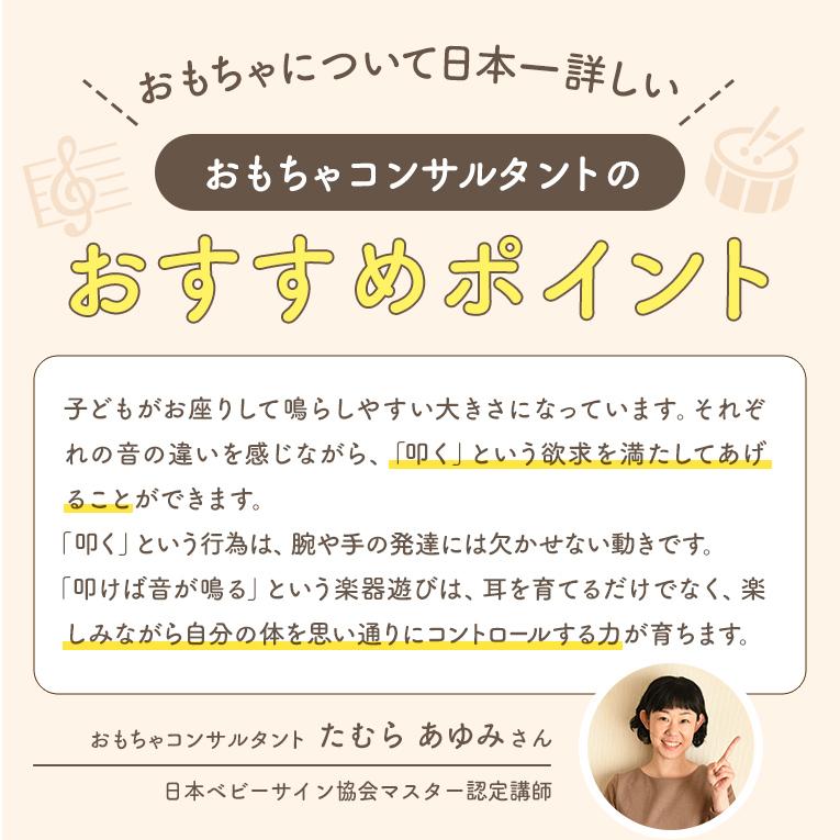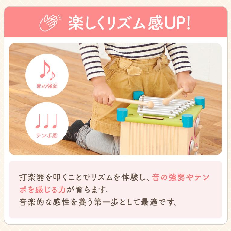 備考6面の音遊びができる音の鳴るきのおもちゃ。キューブ型の本体には鉄琴、太鼓、ギロ、シンバル、鈴の音遊びを搭載。2本のバチや手を使って遊ぶことができます。