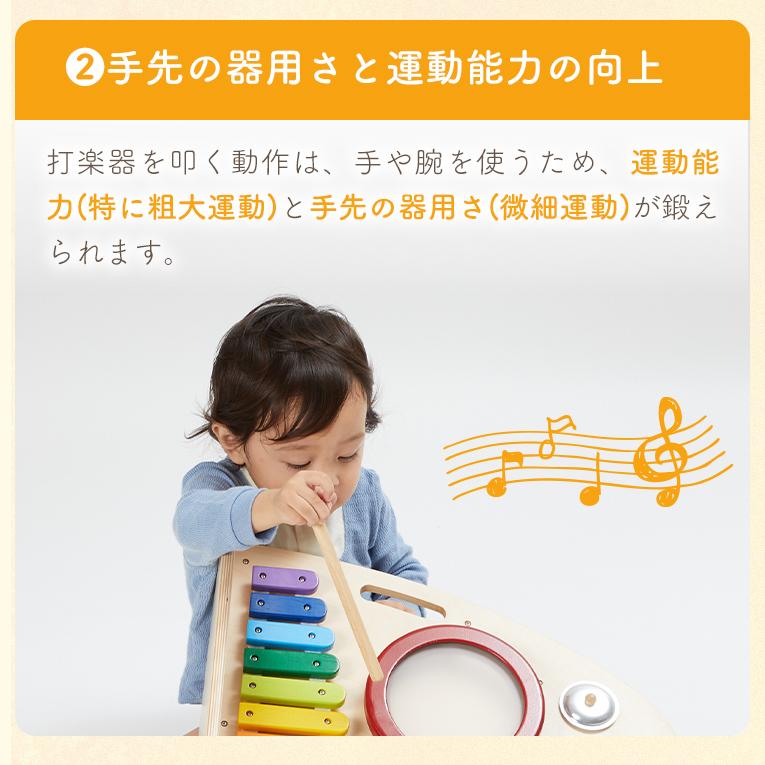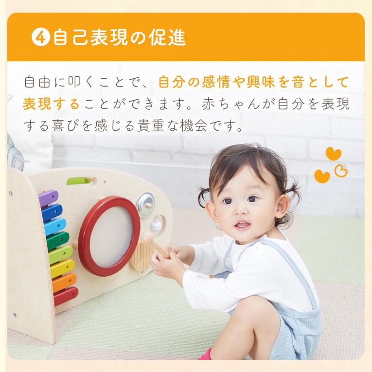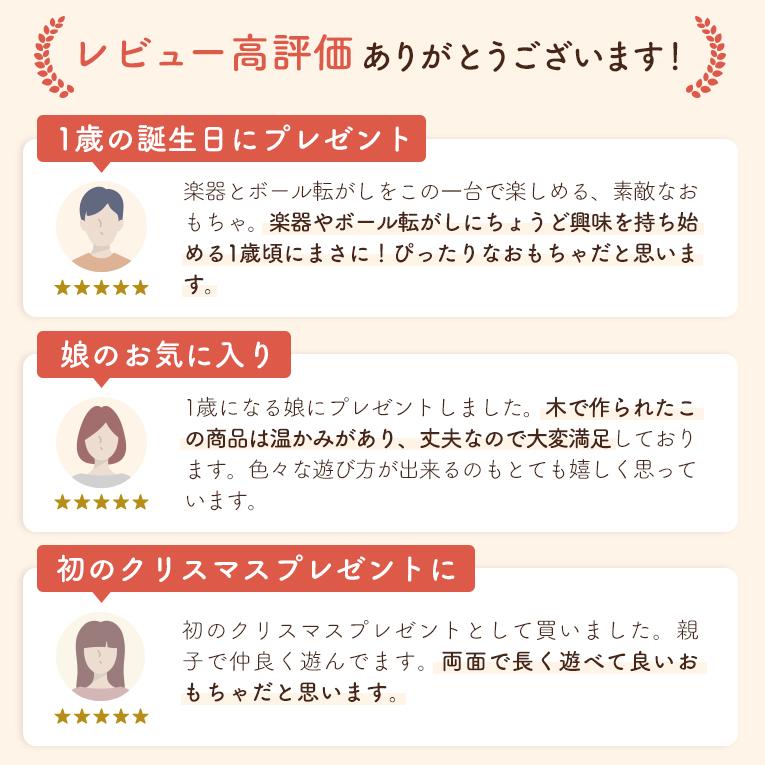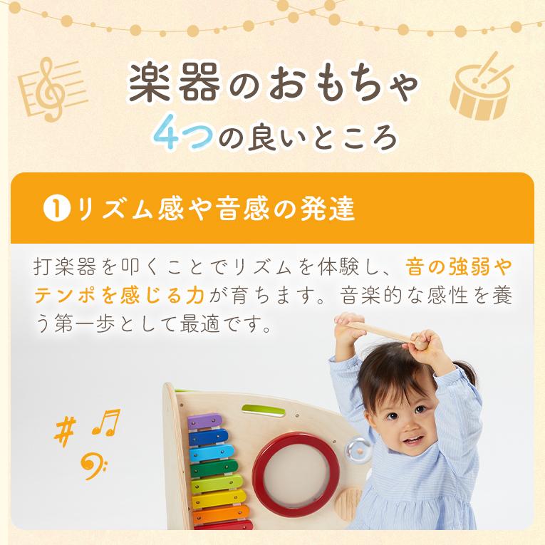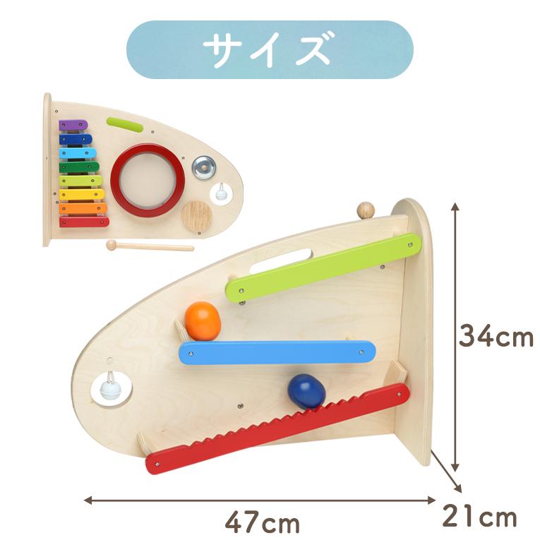 備考両面で遊べる木のおもちゃ。木琴・太鼓・シンバル・鈴・ギロの5種類の音遊びと転がし遊びが両面で楽しめる大型トイ。本体を横に倒して音遊びもできます。持ち運びに便利な持ち手つき。赤ちゃんに優しい肌触り・天然木のぬくもりは木のおもちゃの特性です。