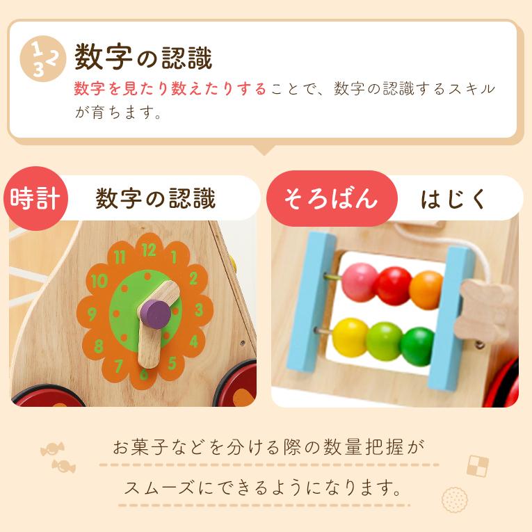 知育の部分もすべて木で作られている手押し車です。