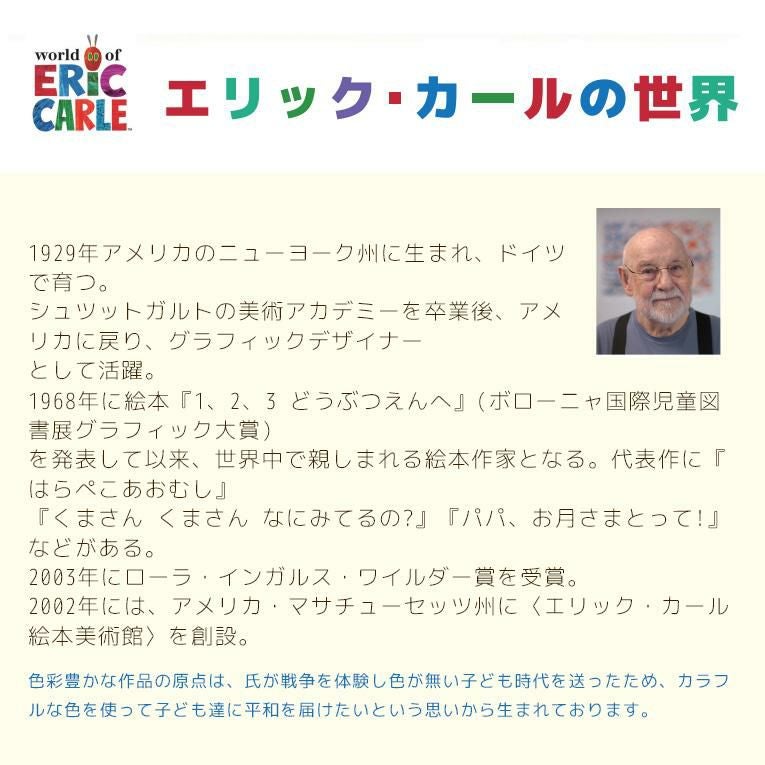 1929年アメリカのニューヨーク州に生まれ、ドイツで育つ。グラフィックデザイナーとして活躍後、1968年に『1、2、3どうぶつえんへ』を発表し、ボローニャ国際児童図書展グラフィック大賞を受賞。以来、世界的な絵本作家として創作を続ける。代表作に『はらぺこあおむし』『パパ、お月さまとって!』『だんまりこおろぎ』など多数。2003年ローラ・インガルス・ワイルダー賞受賞。