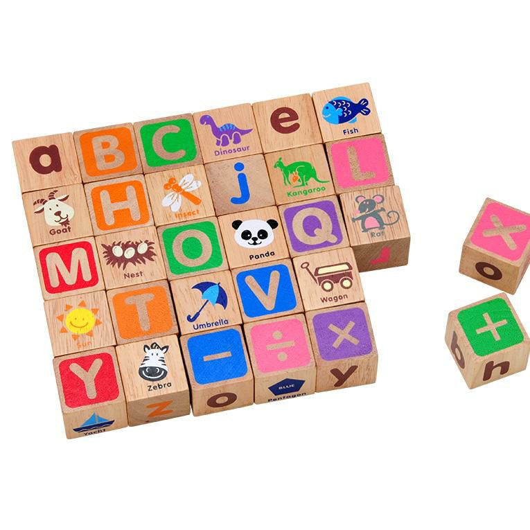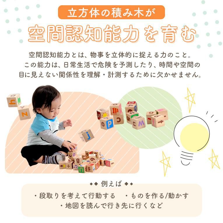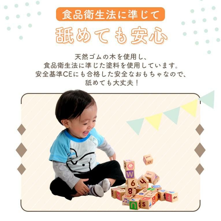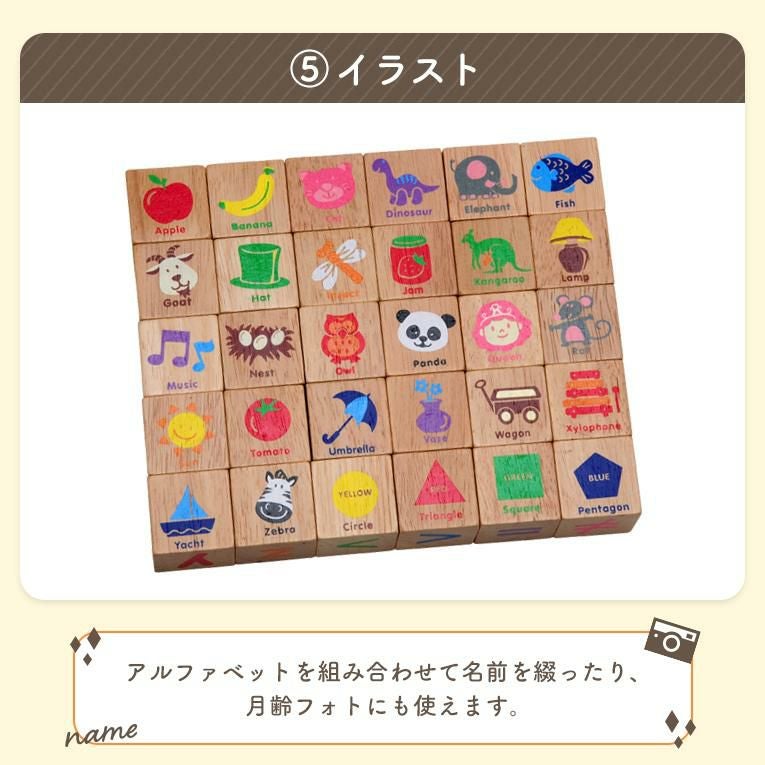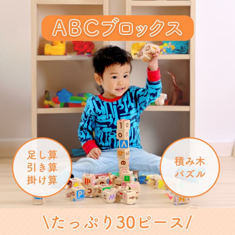 備考30ピースのキューブには「アルファベット(大文字、小文字)」、「数字」、「記号」やアルファベットのそれぞれの文字に対応するイラストがプリントされており、並べ方で単語を作ったり、イラストの単語を覚えたり、足し算したりなど、かしこく遊べます。 単純に積み木としても遊べるほか、英語や算数のお勉強までできるので、ベビーからキッズまで幅広く楽しむことができます。