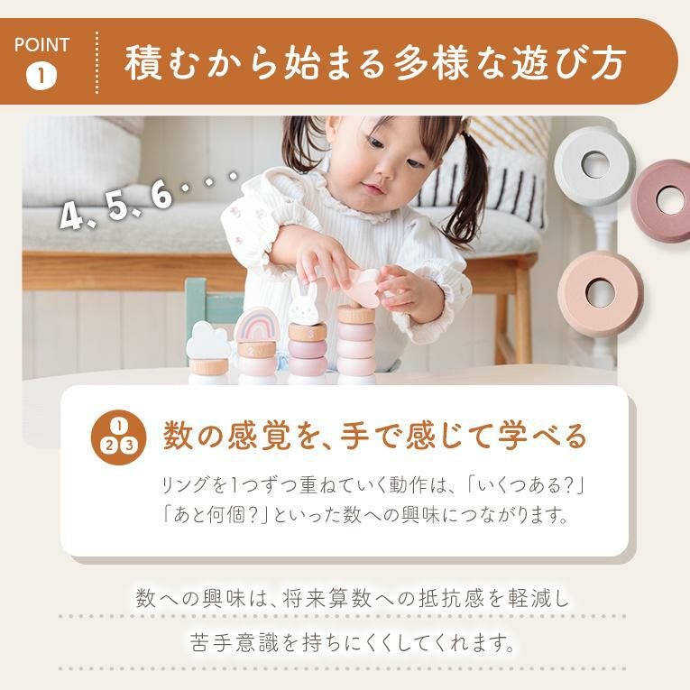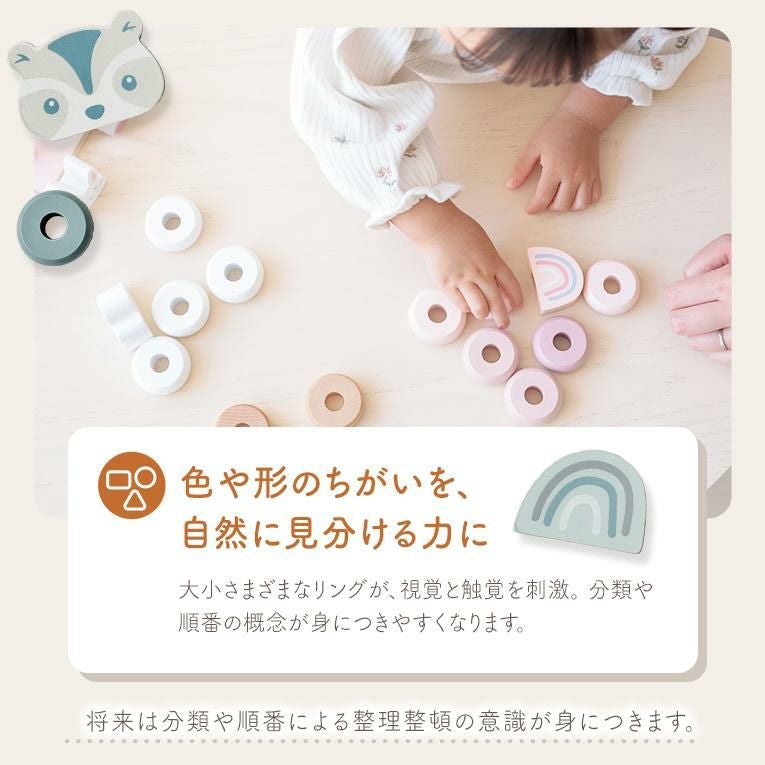 リングをひとつずつ重ねる動作の中には、数への興味、色や形のちがいへの気づき、そして分類や順番といった基礎的な力がつまっています。