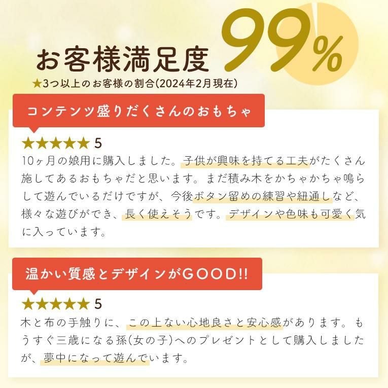 素早い発送 ありがとうございました😊大きさも手頃でな上コンパクトにお片付けが出来てとても気に入ってます。木の温もり、丈夫な布の安心感、爽やかな色使い見た目もとっても素敵です。2才の孫娘も1人で遊んだり、一緒に遊んだりとこの商品をクリスマスプレゼントにして満足してます