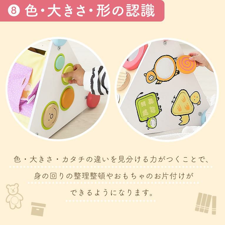 | 備考 | 赤ちゃんが大好きな遊びとママ推薦のトレーニングが詰まった、まさにマルチトイ!! お子様の大好きな音遊びやお絵描きボード、カタチ合わせのマグネットパズルやスタックトイ。 ジッパーやボタン掛けのトレーンニングまでお任せください! お子様の様々な好奇心を満足させるこの木のおもちゃで赤ちゃんの指先の発達をお手伝い!