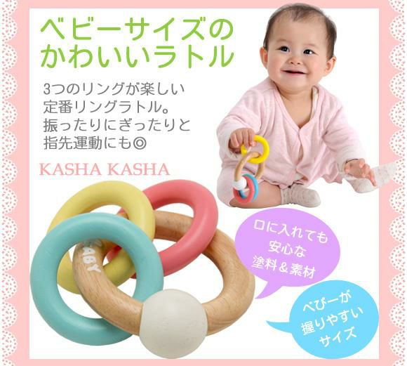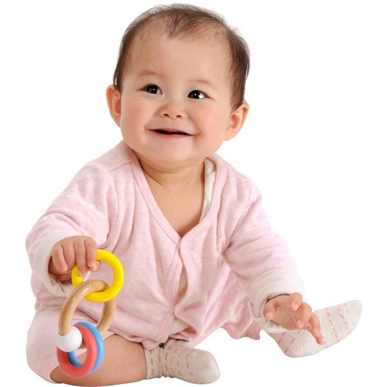 3色リングがぶつかり合ってラトルを振るときれいな音を奏でます。 ポップなカラーリングでご出産祝いにも◎
