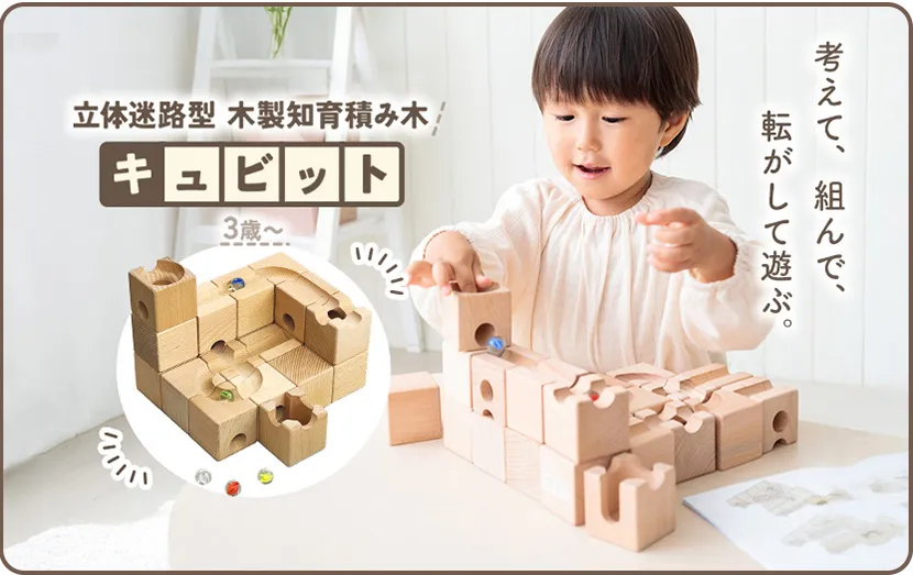 考えて、組んで、転がして遊ぶ!立体迷路型の木製知育積み木です キュビット 36ヶ月~