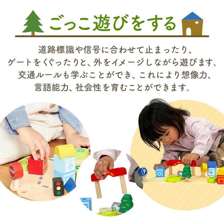 備考道路や交通標識を組み合わせて。オリジナルの街が作れる木のおもちゃのセット。 たくさんの組み合わせを作ることで 創造力を養うことができます。
