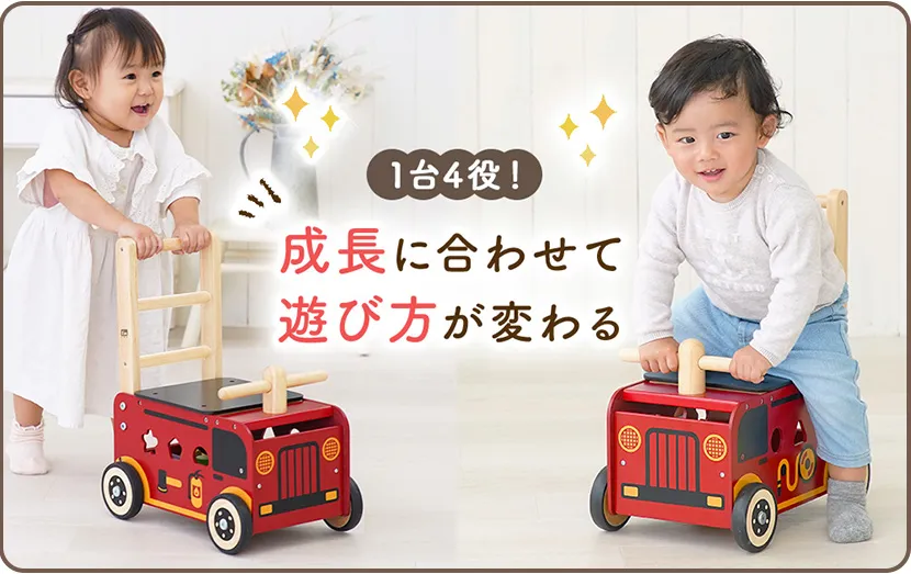 活発に動き回る男の子には、手押し車だけではなく乗って遊べるものが良いでしょう。 男の子らしい車モチーフの手押し車が人気で、「消防車」や「ドクターイエロー」の手押し車がおすすめです。