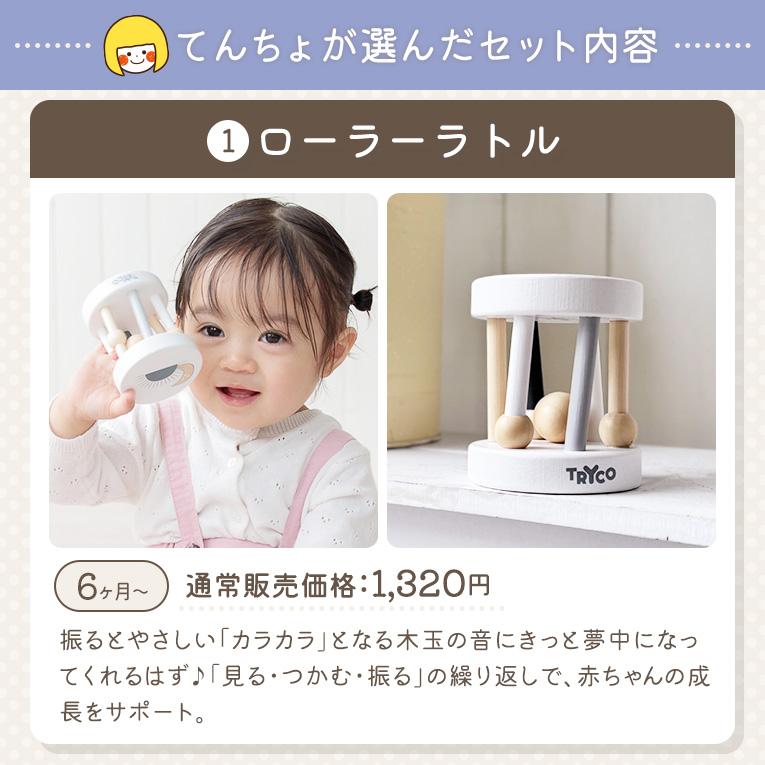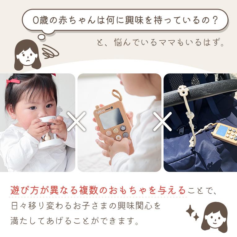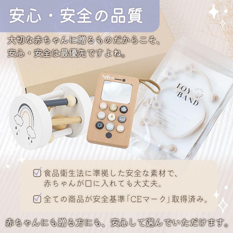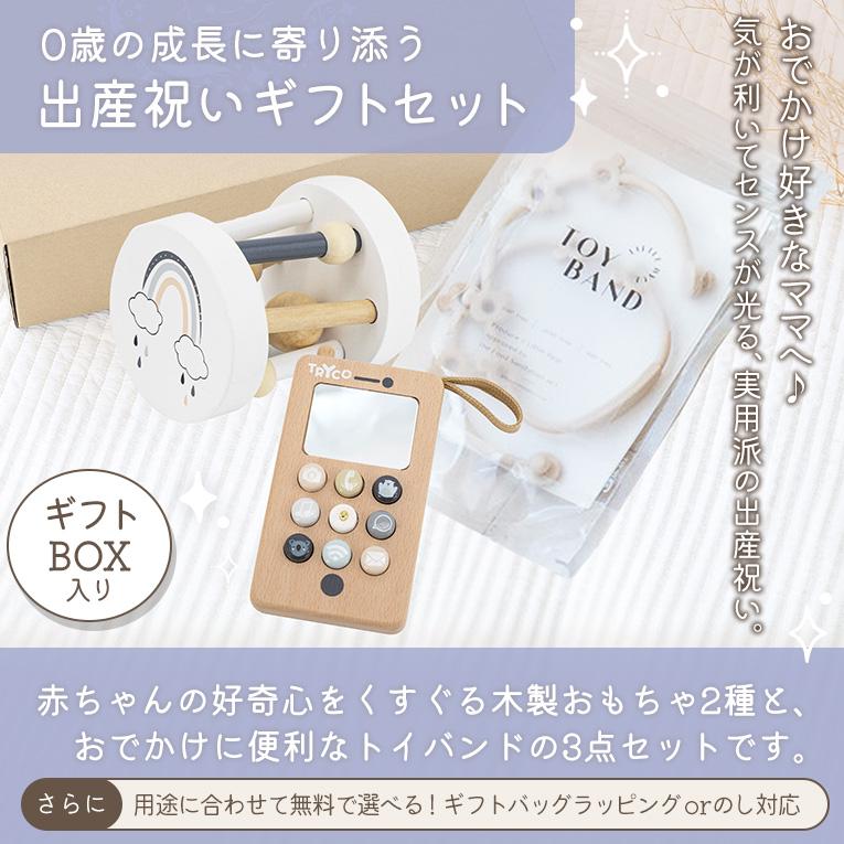 0歳の成長に寄り添う出産祝いギフトセット。赤ちゃんの好奇心をくすぐる木製おもちゃ2種と、おでかけに便利なトイバンドの3点セットです。