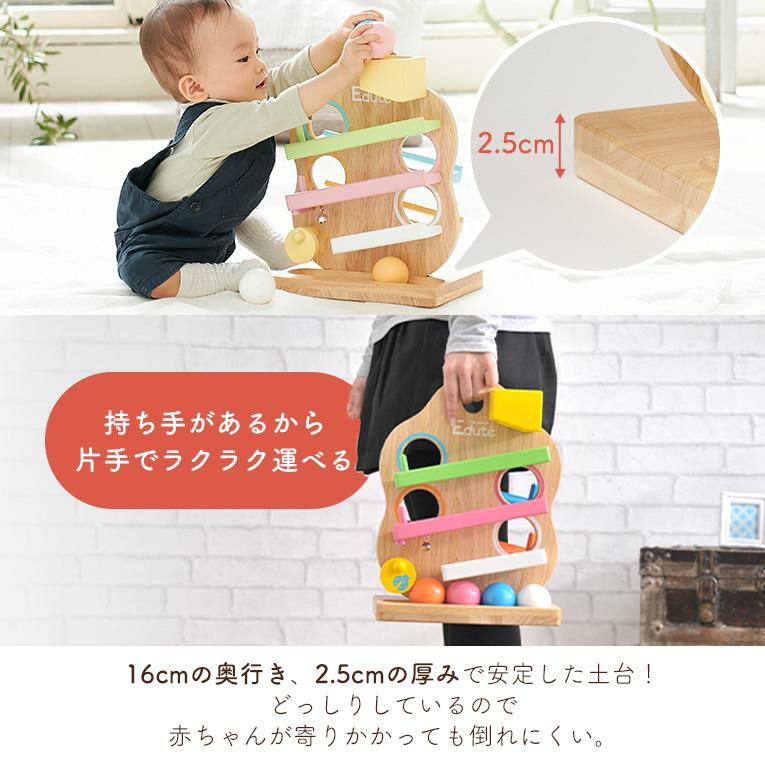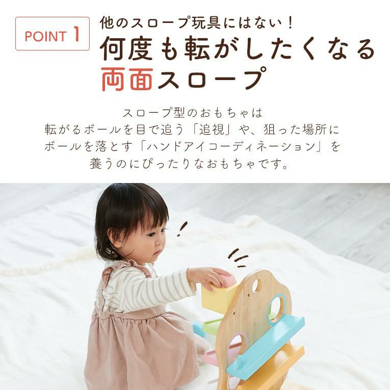 何度でも転がしたくなる木のおもちゃのスロープトイです。優しい肌触りの天然木の赤ちゃんへのプレゼントにぴったりです。