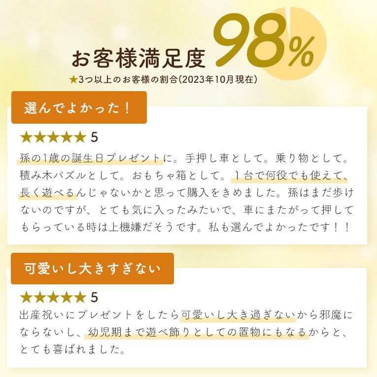 箱から出し組み立てる時から興味津々で組み立ての邪魔をしていました。次に積木を見つけて積木に気を取られている間に組み立て完了。まだアンヨが上手に出来ない為、押し車で遊ぶ事は出来ませんでしたが手で押したり引いたり積木を出したりしまったりして遊んでいました。乗って動かす事も今は足が届かずですが座らせるニコニコして座ってました。