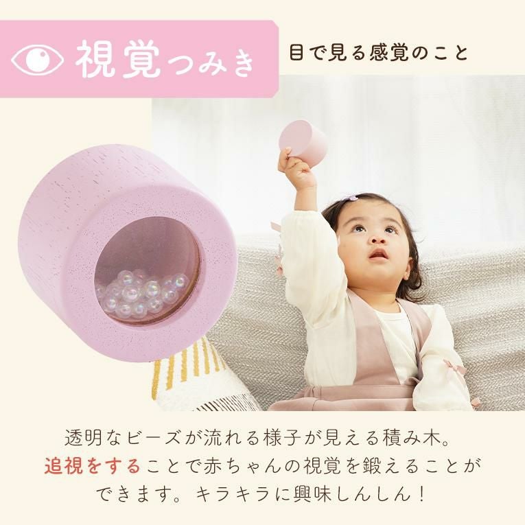もうすぐ1歳になる孫娘に購入。振ると音が鳴り、ビーズがキラキラ。カチカチ叩いたり舐めたりと とても気に入っている様子です。積み木の数は少ないですが1歳児には十分楽しめるオモチャです。