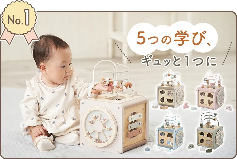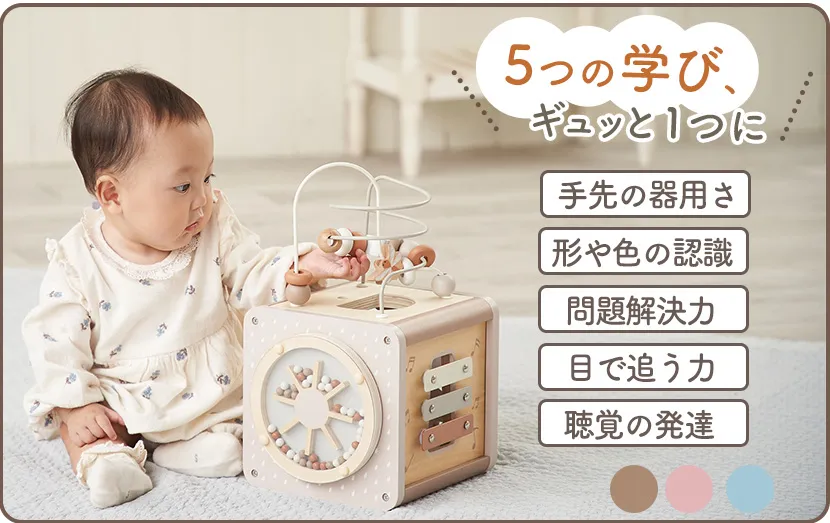 見たり触ったり考えたり、5つの遊びが「できた!」をそっと応援します♪ 指先を器用に使い始める1歳さんの手と脳の発達をバランスよくサポートするのにぴったり!遊ぶ中で生まれる達成感が、豊かな感性と「やってみたい!」という意欲を優しく育んでくれますよ。 アクティビティキューブ