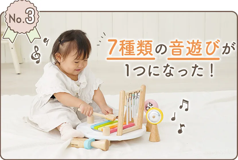 木琴や太鼓、シンバルにベルなど、7種類の楽器が1歳さんのリズム感を豊かに刺激します♪ 本店限定の優しいカラーがお部屋にも馴染み、「次は何を鳴らそうかな?」と夢中で遊ぶ姿を長く見守れる一台ですよ。 メロディーゴーラウンドソフトカラー