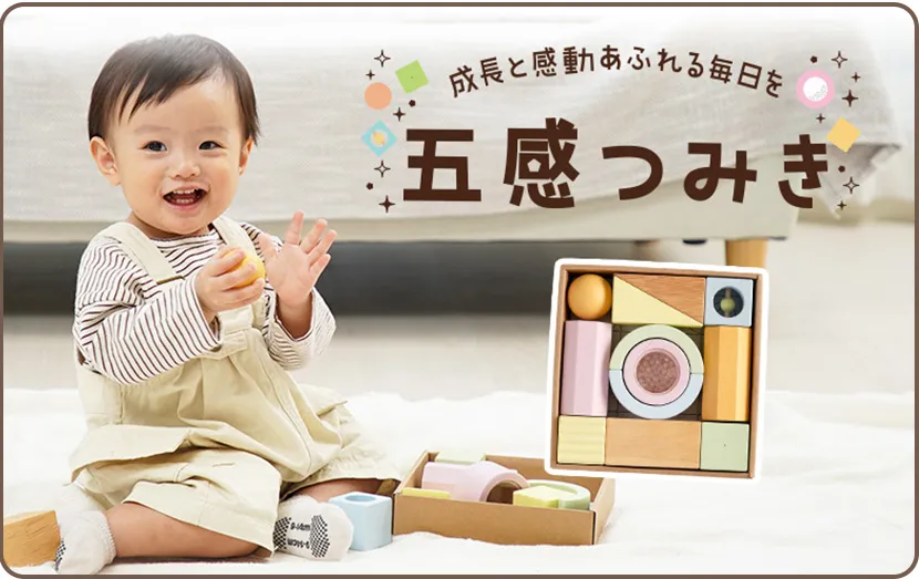 「見て、触れて、聴いて」と、五感をフルに使って楽しめる5つの仕掛けパーツが、1歳さんの豊かな感性を心地よく刺激します♪キラキラ光るパーツや不思議な音が鳴るパーツは、「これ何だろう?」という探究心を育むのにぴったり! 五感つみき