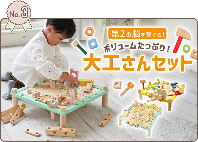 トンカチやドライバー、レンチを使って本格的にトントン♪ 大きな作業台で思いきり遊べる、3歳の夢中を引き出す大工さんセットです! カーペンターテーブル