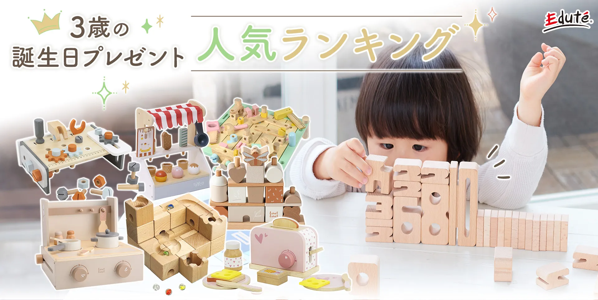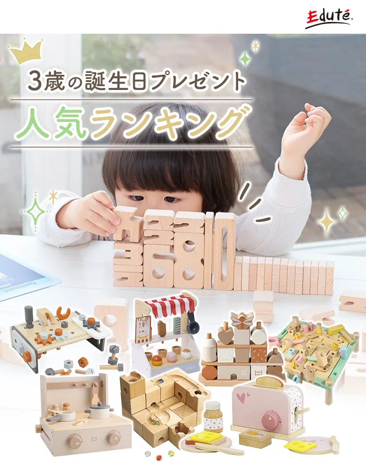エデュテでは3歳誕生日プレゼントにピッタリな、お子様に優しい木のおもちゃ・知育玩具を沢山取り揃えています。3歳誕生日にはお子様の成長に合わせたおもちゃを選んであげることによって、自然とお子様の出来る事、成長を促します。お子様に最良のおもちゃを提供し、無限の可能性を秘めた頭脳や感性を生き生きと育んであげたい。そんな願いを込めてエデュテは運営しています。上質なおもちゃで遊ぶ事によって、お子様の健やかな成長を感じれることが出来るでしょう。