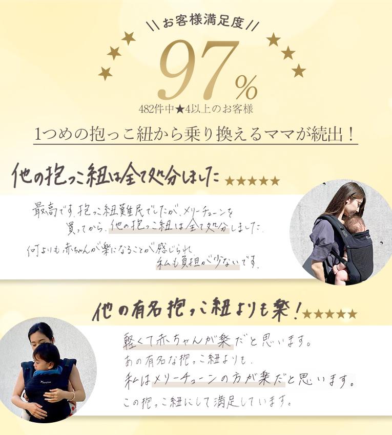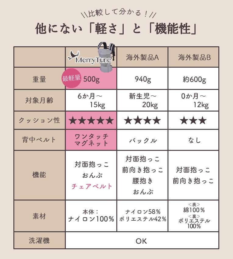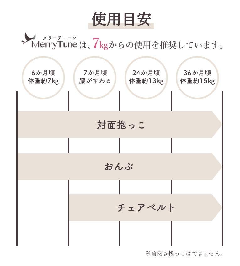 | 備考 | 赤ちゃんが成長して重くなり、新生児期からの抱っこ紐が不快に感じてきたママに朗報★ ペットボトルわずか500gの超軽量抱っこ紐「Merry Tune(メリーチューン)」。