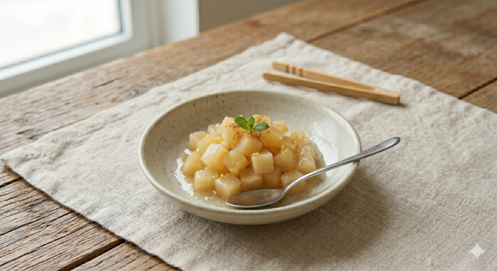 加熱することで甘みが増して消化にも優しいりんごのコンポート。そのままでも、ヨーグルトに混ぜても◎