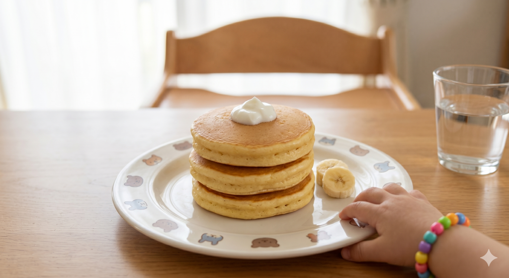 市販のホットケーキミックスは砂糖が多いので、砂糖控えめタイプを選ぶか、薄力粉+ベーキングパウダーで代用するのがおすすめです。