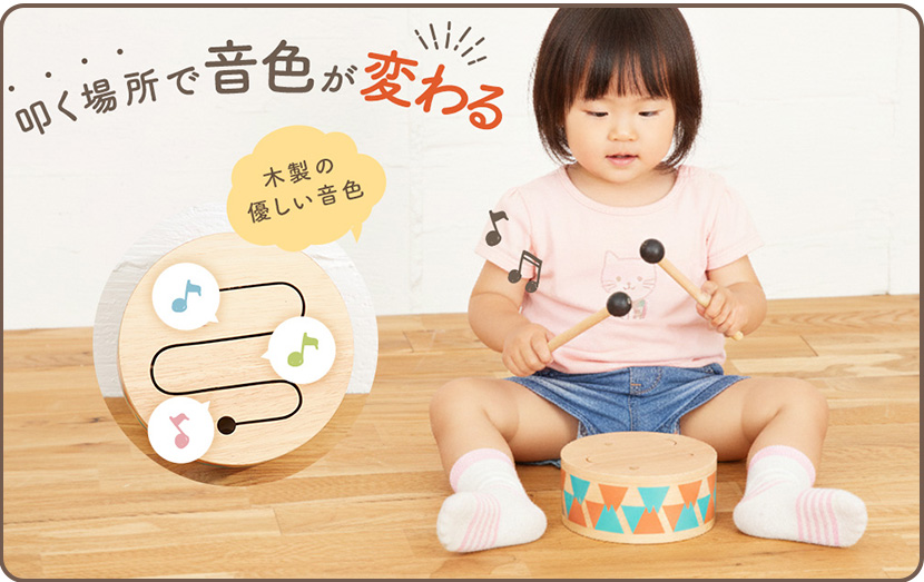 叩く場所によって音色が異なる楽しい木のおもちゃの太鼓♪