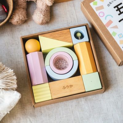 いわゆる“普通の積み木”ではないところが購入の決め手です。球体のものや香りのあるもの、ビーズが入って音がするものなど、ひとつひとつ形や仕掛けが違っていて、大人の私までつい手に取ってしまいました。