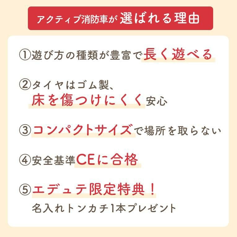 他の画像を見る 【名入れトンカチプレゼント】アクティブ消防車 < 2歳 3歳 > I’m TOY(アイムトイ) 当店特別価格 ¥ 9,900 税込 法人価格 詳細を見る お気に入りに登録する 名入れ無料 送料無料 2歳~ 1年保証
