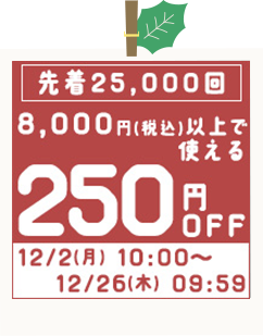 12月は運送会社の混雑状況や天候により、特にクリスマス付近のお届けには通常より日数を要する場合がございます。