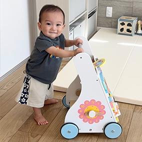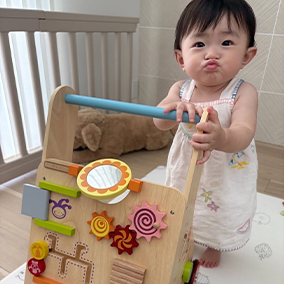 9種類の指先遊びができる手押し車。歩き疲れたら座って指先知育を楽しもう♪